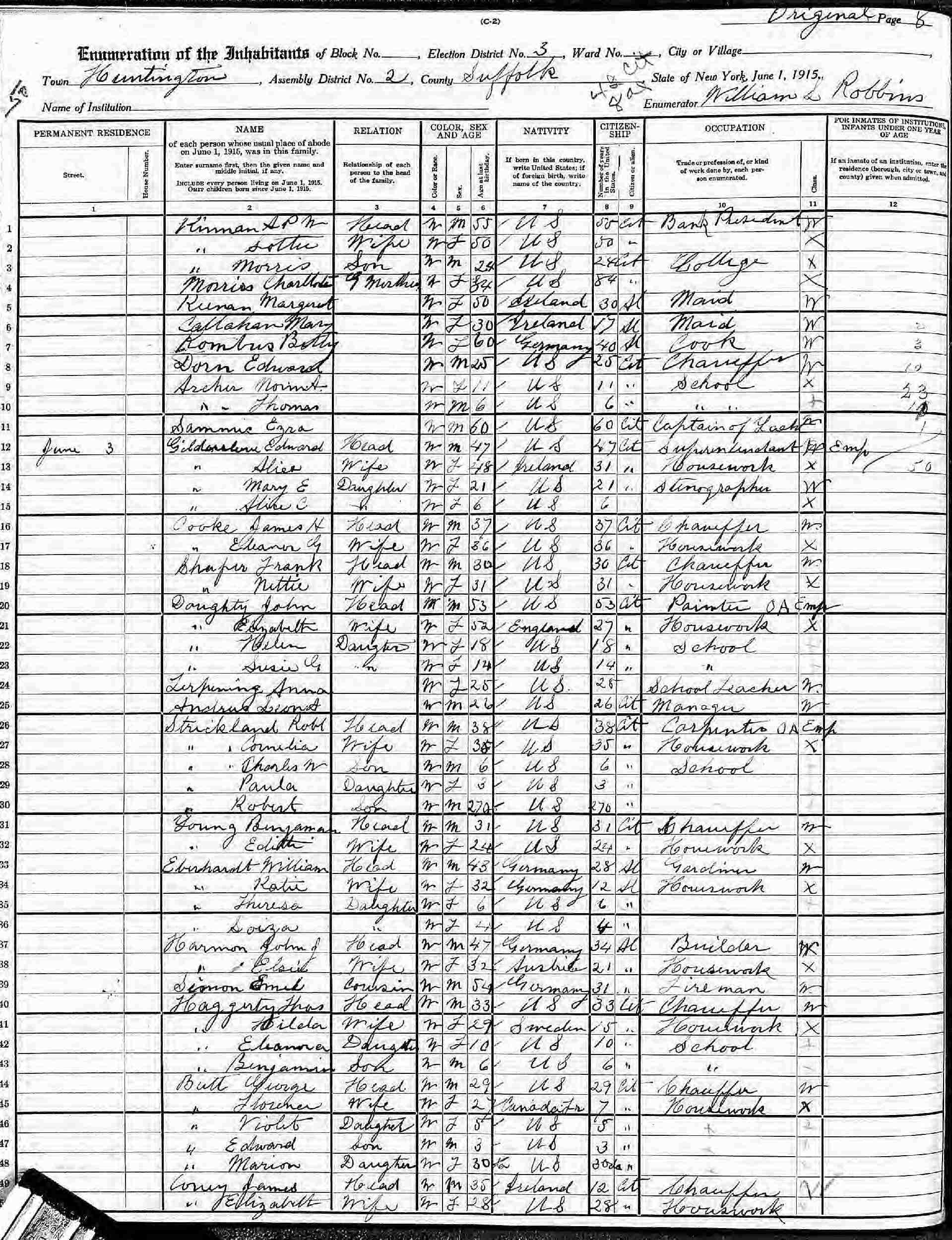 June 1, 1915 - Election District 3, Assembly District 2, Huntington, Suffolk County, New York (w/brother Thomas in Kimman household).