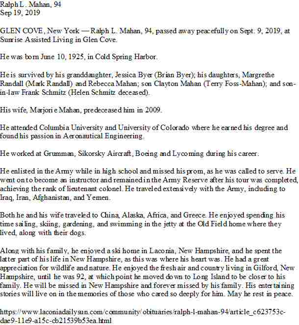 Died: September 9, 2019 in Sunrise Assisted Living, Glen Cove, Oyster Bay, Nassau County, New York.