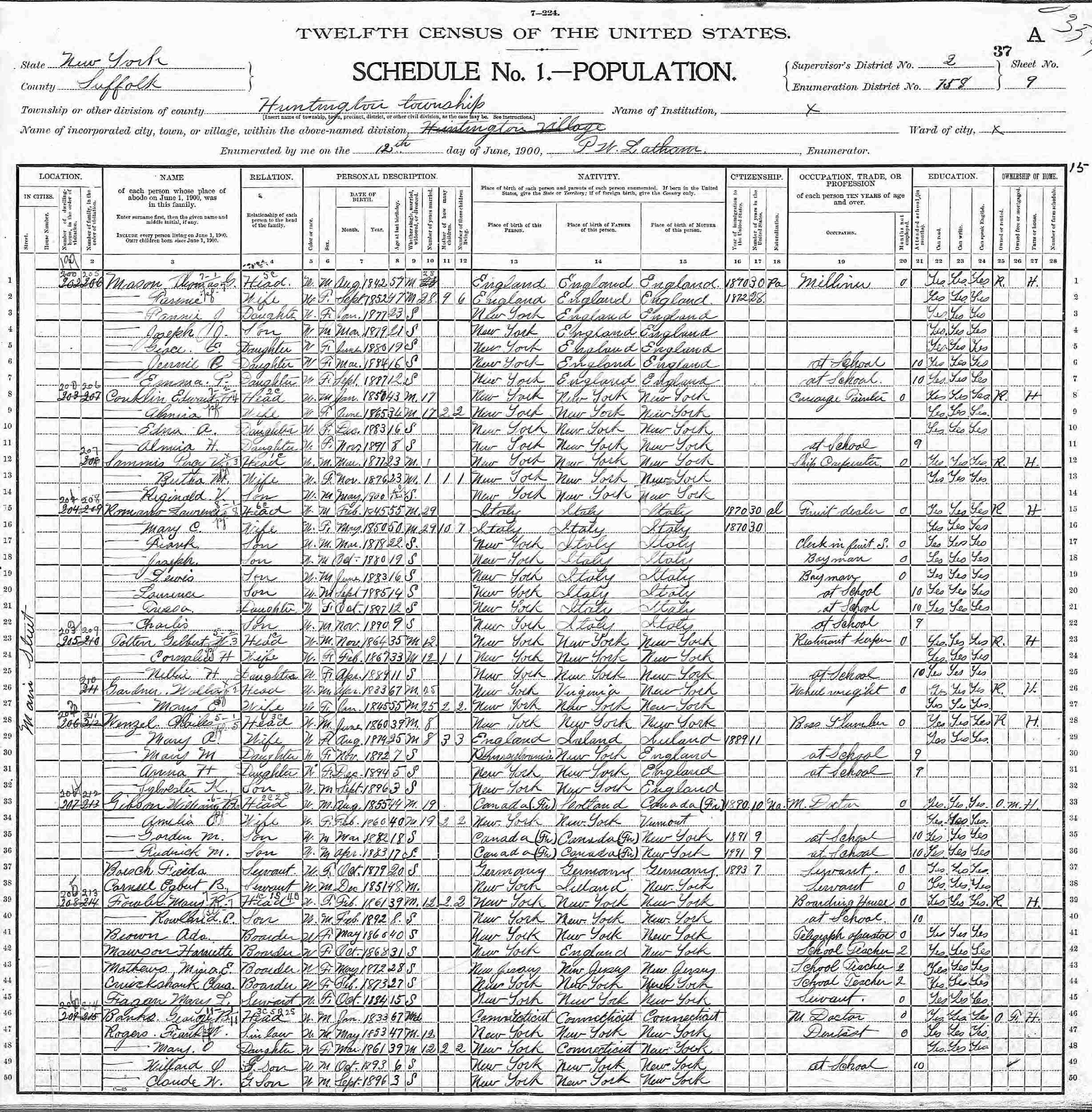 June 12, 1900 - Main Street, Supervisor's District 2, Enumeration District 758, Huntington, Suffolk County, New York.
