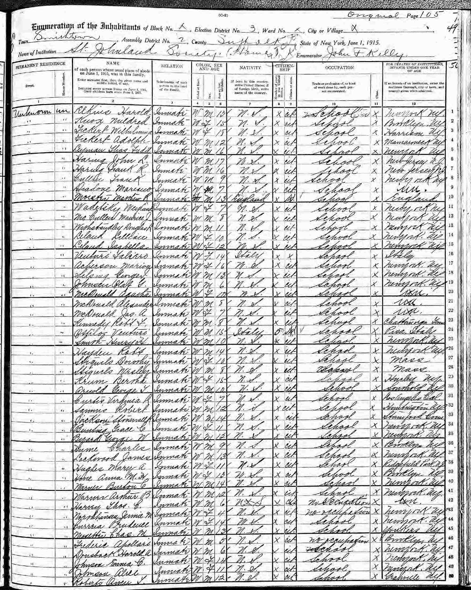 June 1, 1915 - St. Johnland Society Home, Election District 3, Smithtown, Suffolk County, New York (listed as inmate).
