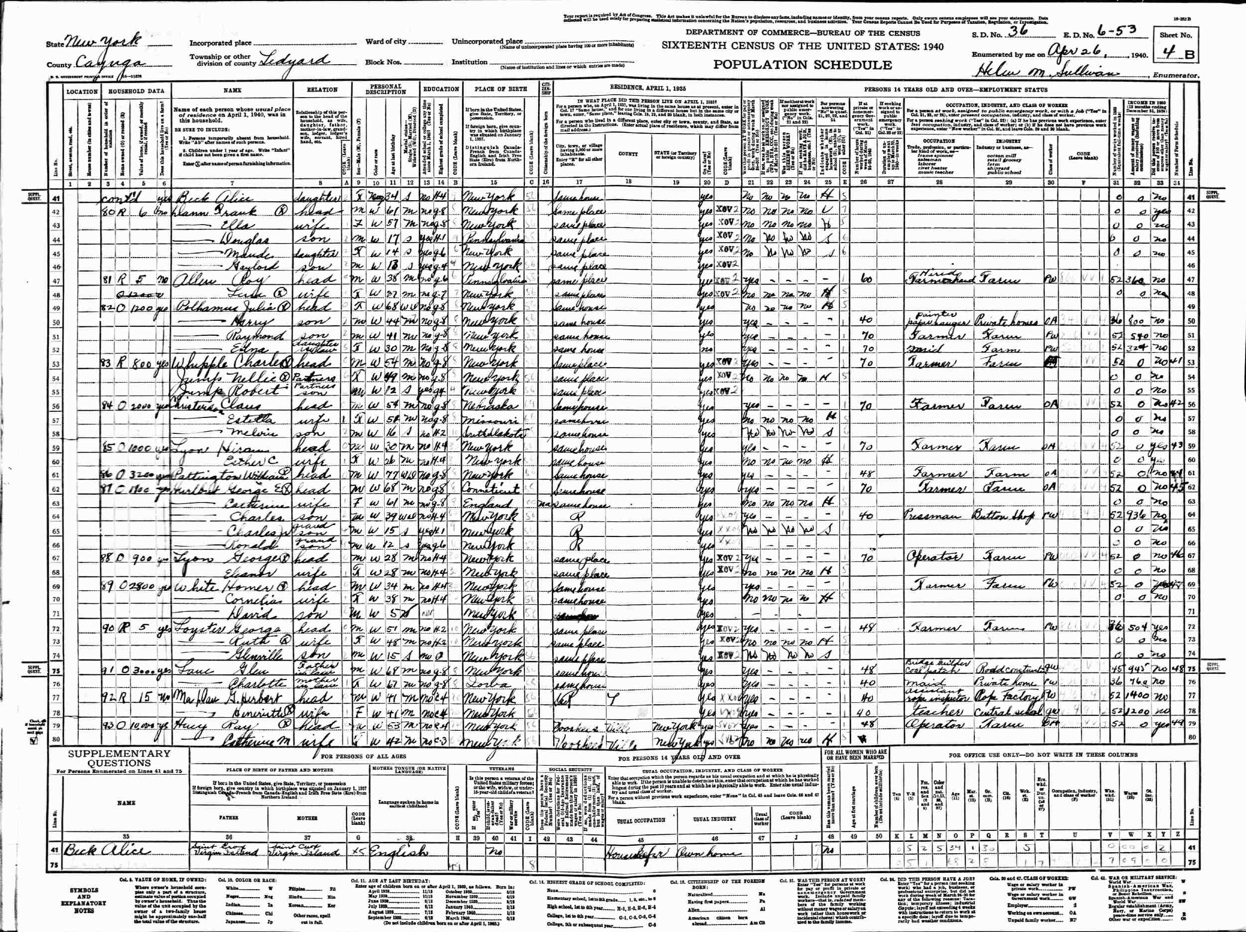 April 26, 1940 - Supervisor's District 36, Enumeration District 6-53, Ledyard, Cayuga County, New York.