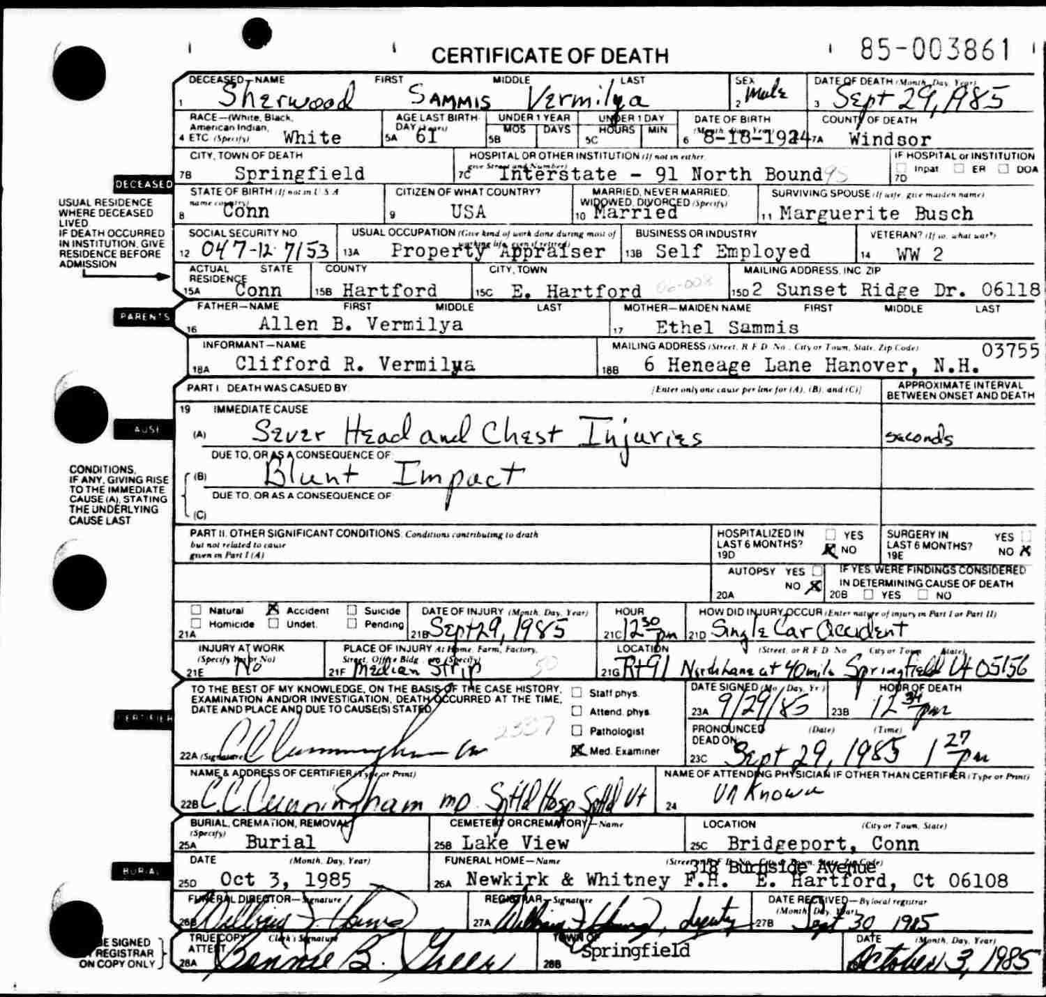 Died: September 29, 1985 in Springfield, Windsor County, Vermont.