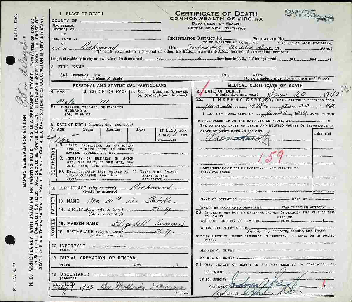Notes for UNNAMED SON GATKE: Son of William A and Elizabeth R (Sammis) Gatke. Born: January 20, 1942 in Richmond, Henrico County, Virginia. Died: January 20, 1942 in Richmond, Henrico County, Virginia. (Death Certificate: #1942028725.)