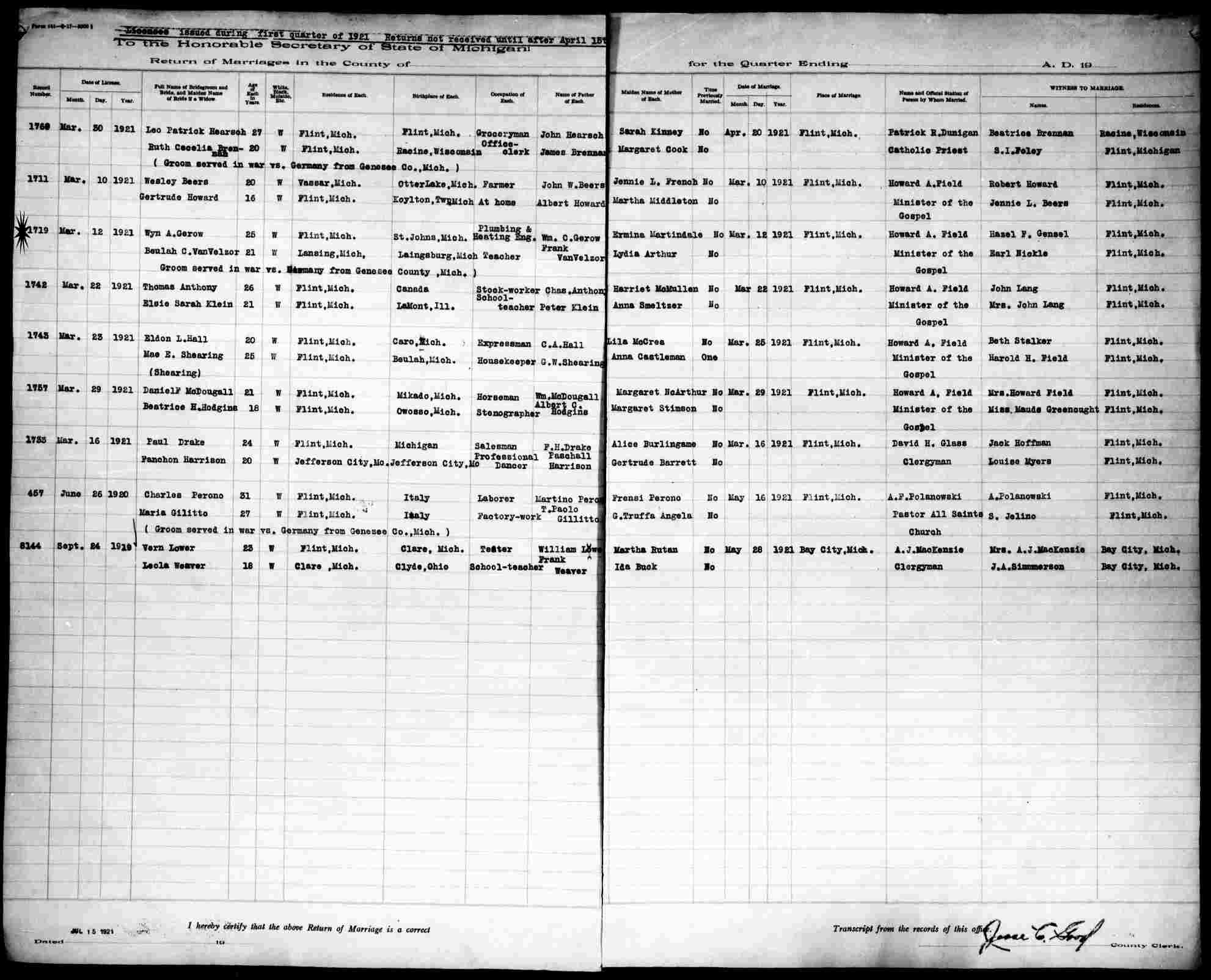 Married: Wyn A Gerow February 12, 1921 in Flint, Genesee County, Michigan.