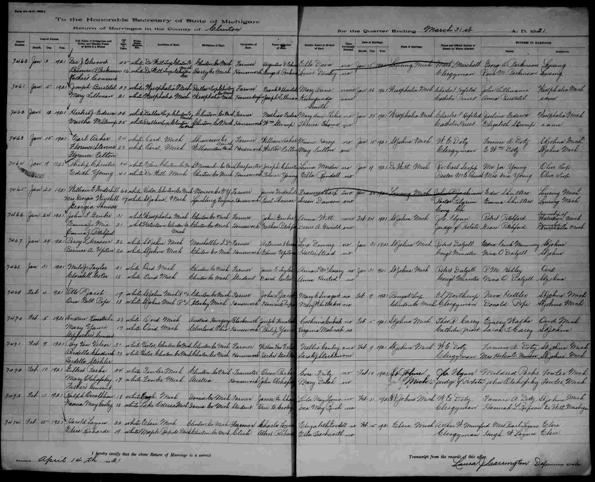 Married: (1) Orley D Chadwick March 11, 1908 in Ovid, Clinton County, Michigan.