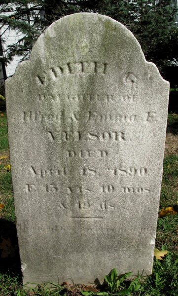 Gravestone Inscription: Daughter of Alfred & Emma F. Velsor 15 yrs 10 mos & 19 ds.