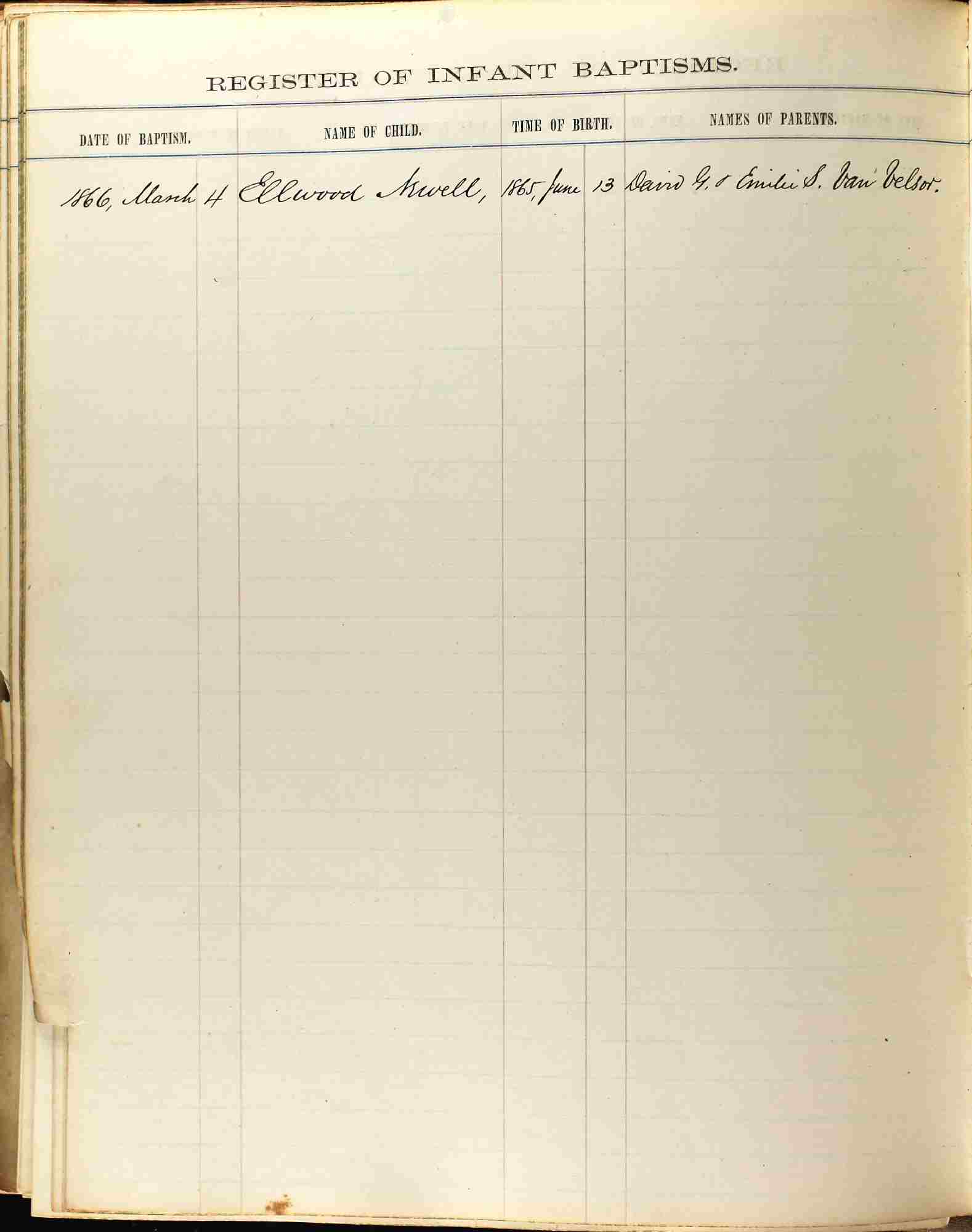 Baptism: March 4, 1866 in Seventh Presbyterian Church, New York City, New York.