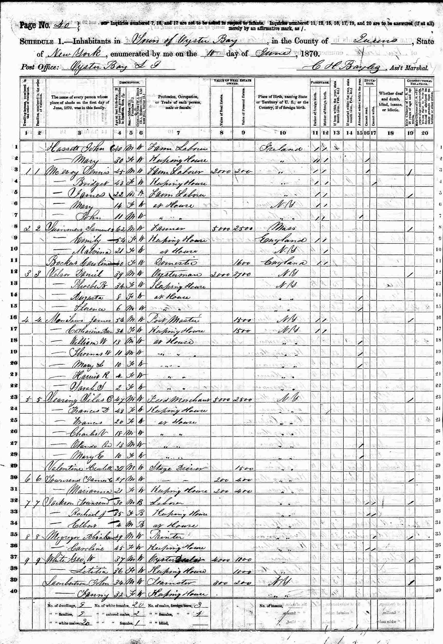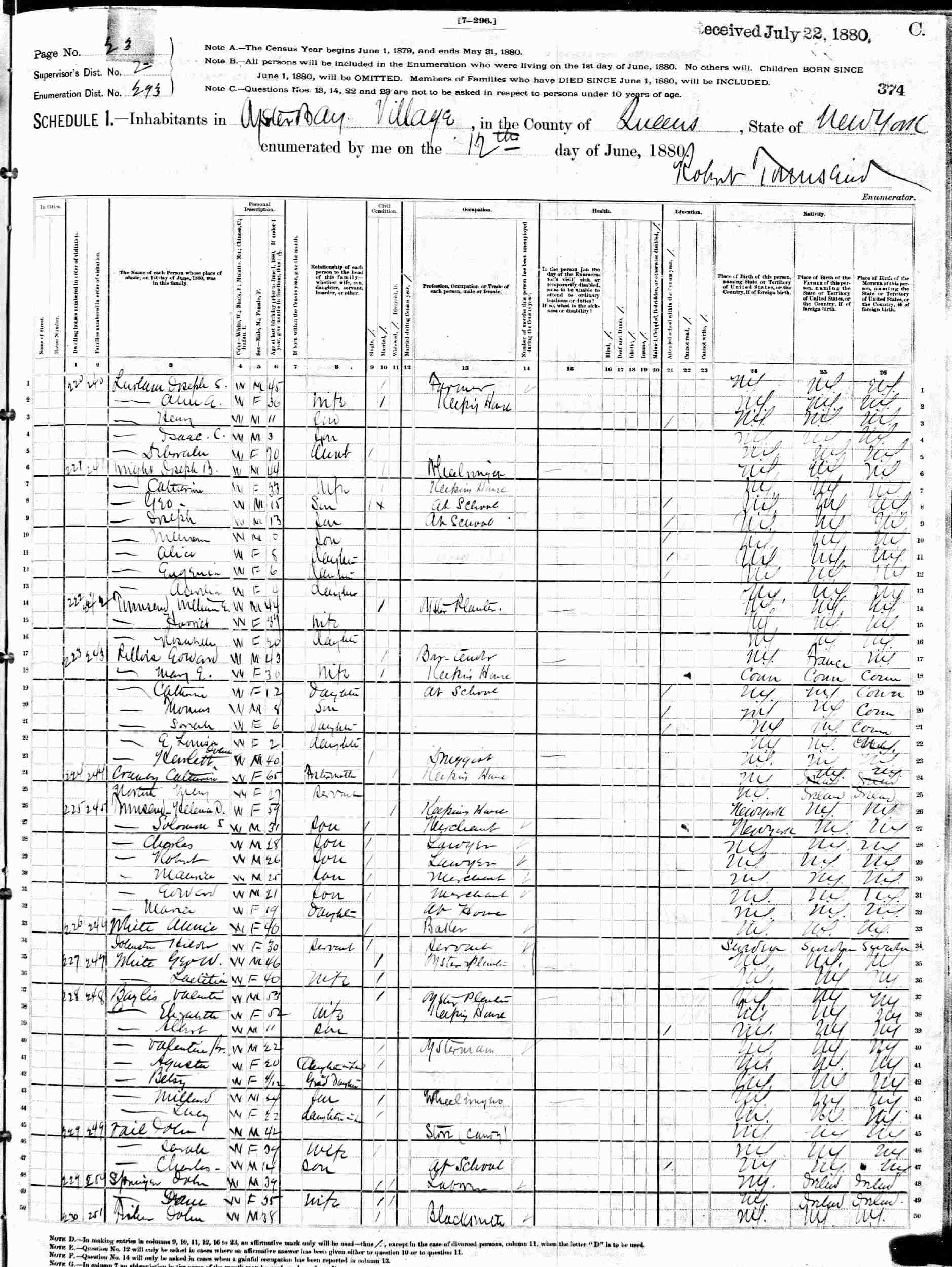 June 12, 1880 - Supervisor's District 2, Enumeration District 293, Oyster Bay, Queens County (now Nassau), New York.