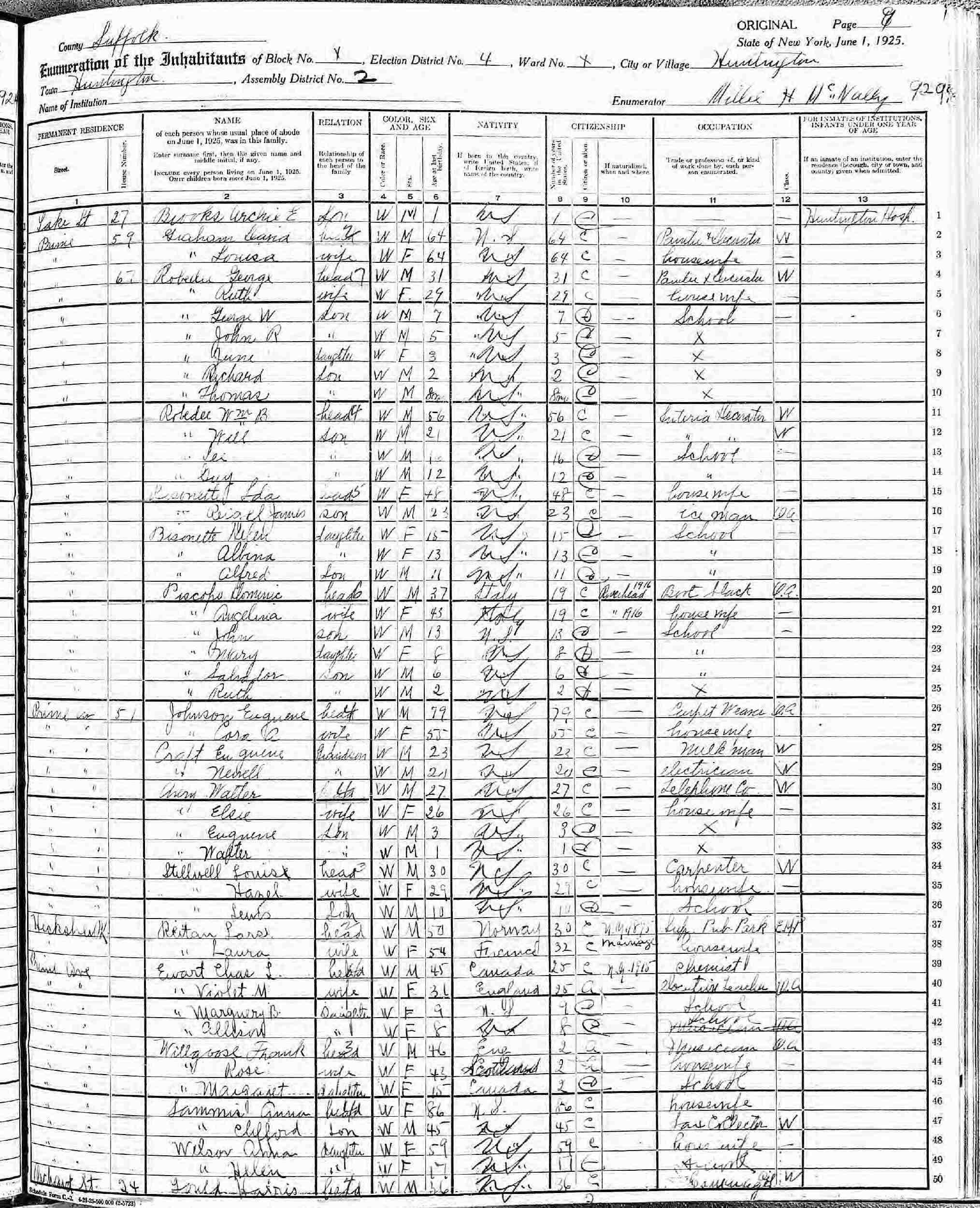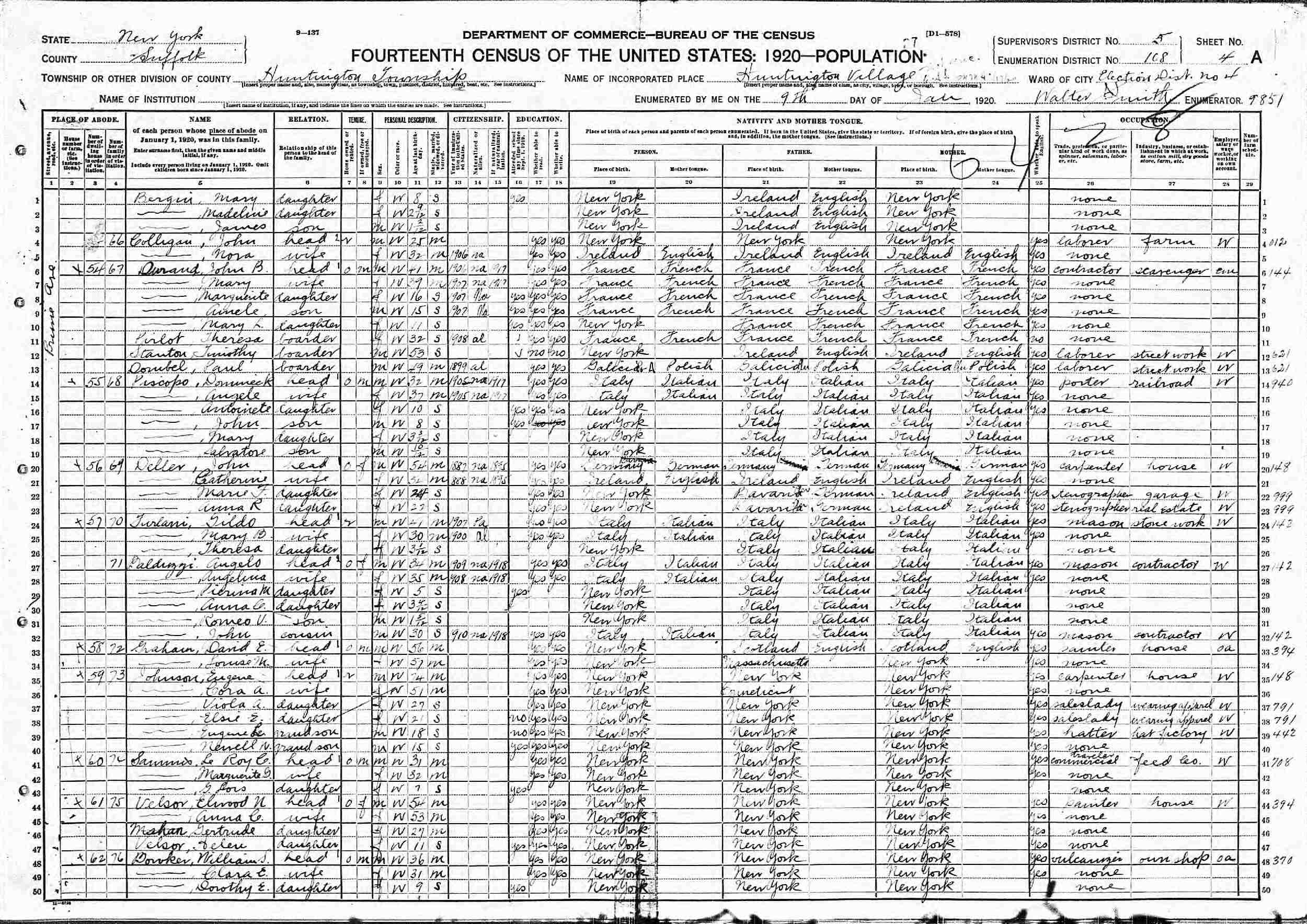January 9, 1920 - Prime Avenue, Election District 4, Supervisor's District 6, Enumeration District 168, Huntington, Suffolk County, New York.