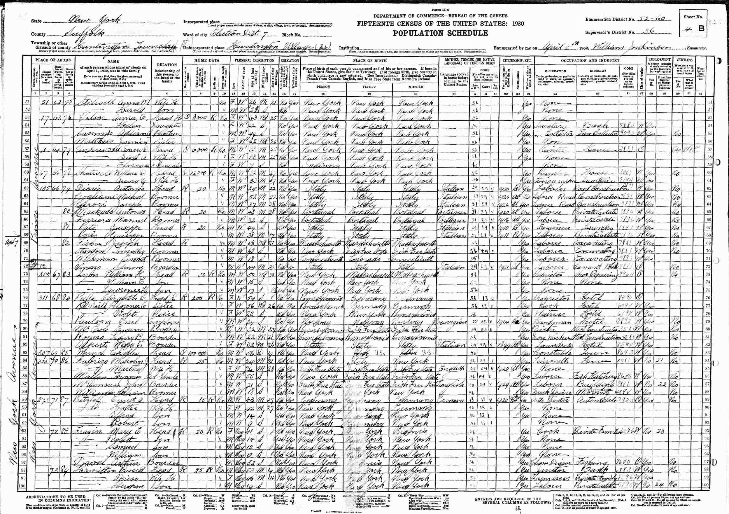April 5, 1930 - 17 Prime Avenue, Election District 7, Supervisor's District 26, Enumeratin District 52-60, Huntington, Suffolk County, New York.