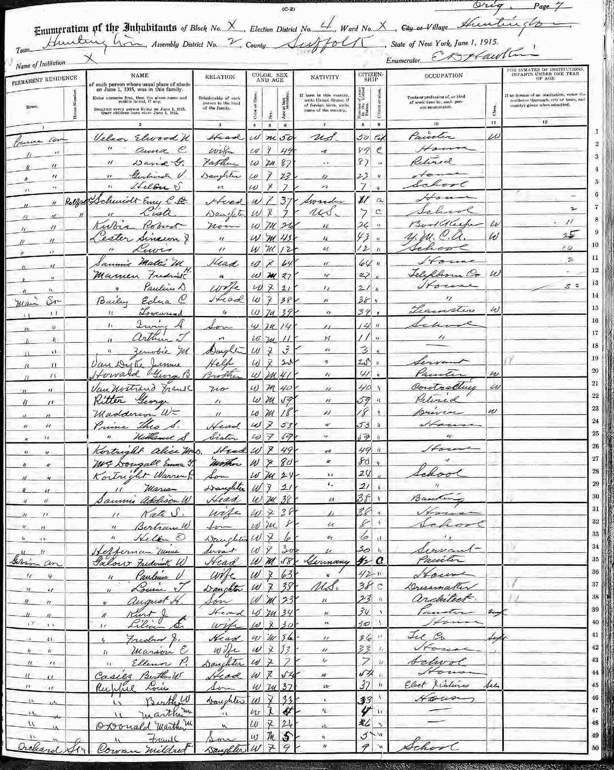 June 1, 1915 - New York State - Prime Avenue, Election District 4, Assembly District 2, Huntington, Suffolk County, New York.
