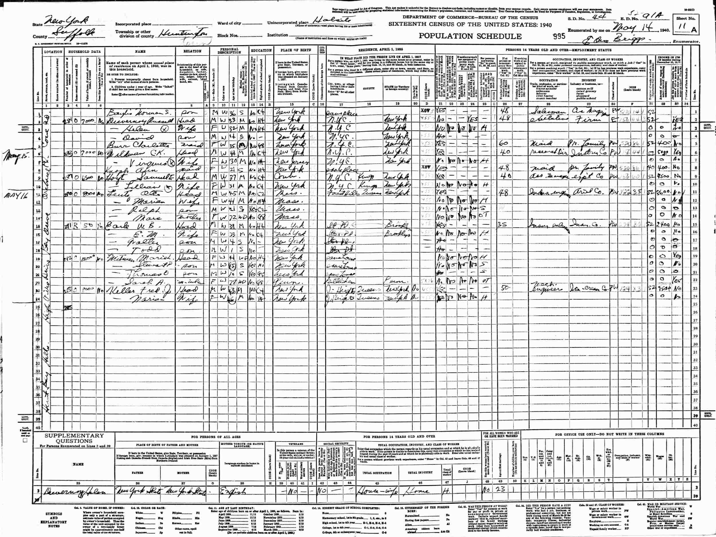 May 14, 1940 - Cove Road, Supervisor's District 44, Enumeration District 52-91A, Halsite, Huntington, Suffolk County, New York.