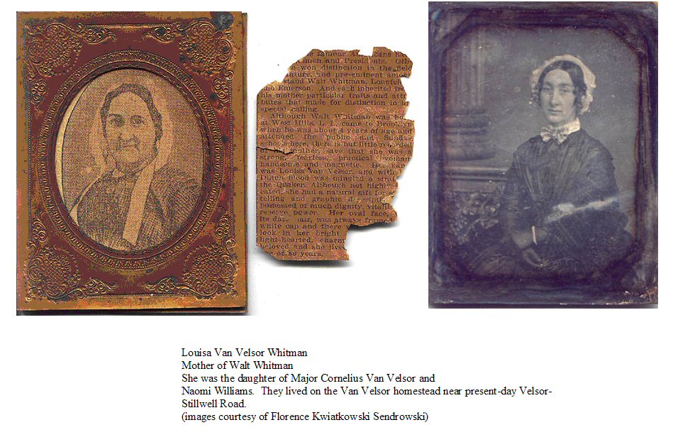 Louisa Van Velsor, the beloved mother of America's greatest poet, was married to Walter Whitman at the Oyster Bay Baptist Church by the Reverend Marmaduke Earle, the pastor there from 1802 to 1856. She was Walt Whitman's emotional touchstone throughout his life. Louisa was a daring and daily horseback rider in her youth. She was less than five feet tall and wore the simple cloths and bonnet of a Quaker. Whitman described his mother as follows, " She was of ordinary medium size (a little plus) of splendid physique and health, a worker, had eight children, was beloved by all who met her, good-lookiing to the last, lived to be nearly 80, no tenderer and more invariable tie was ever between mother and son than the love between her and WW. No one could have seen her, and her father Major Kale (Cornelius) Van Velsor, either in their prime or in their older age, without instantly perceiving their plainly marked Hollandish physiognomy, color, and body-build. Walt Wihitman has all of it; he shows it in his old features now his full flesh and red color."