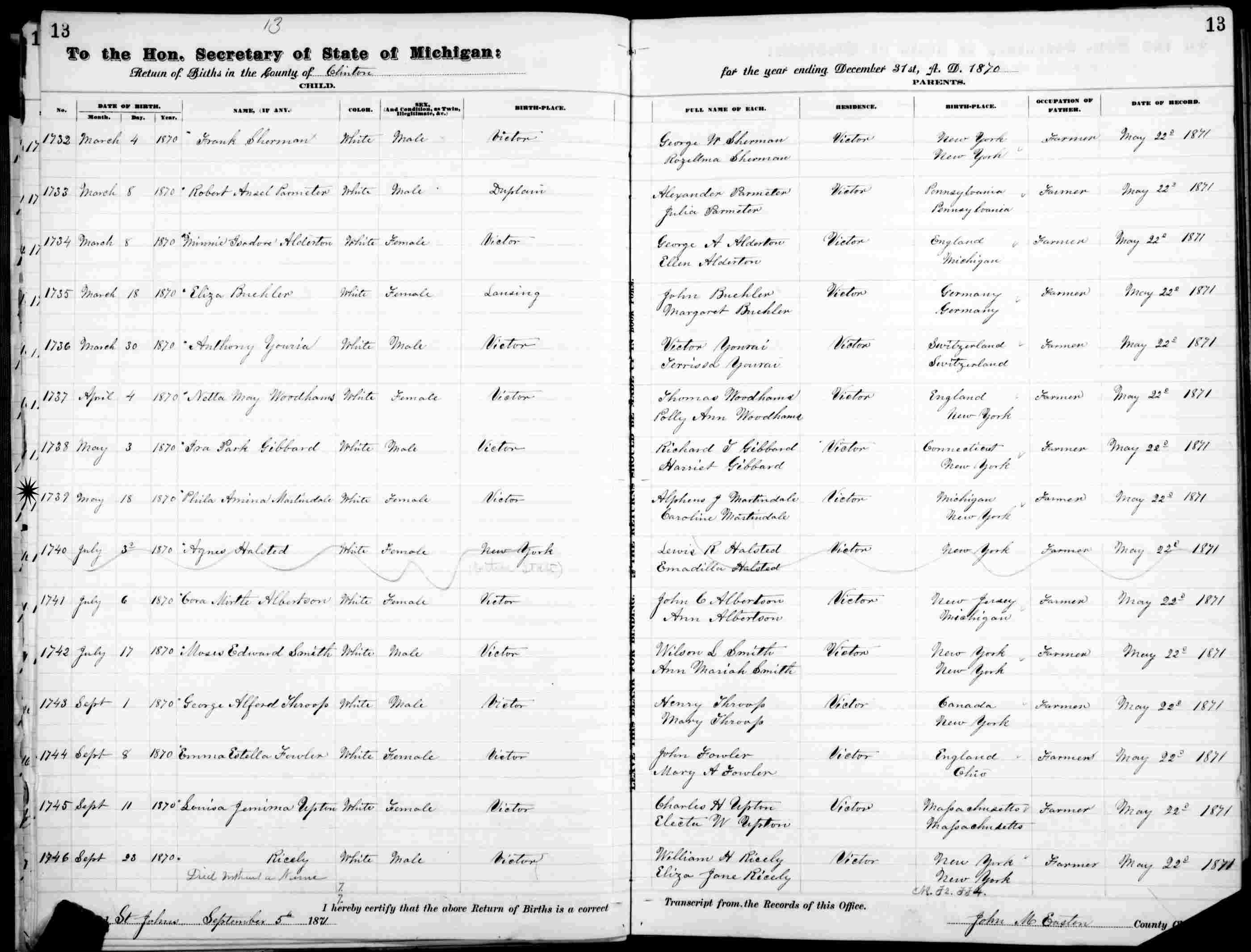 June 25, 1870 - Victor, Clinton County, Michigan.