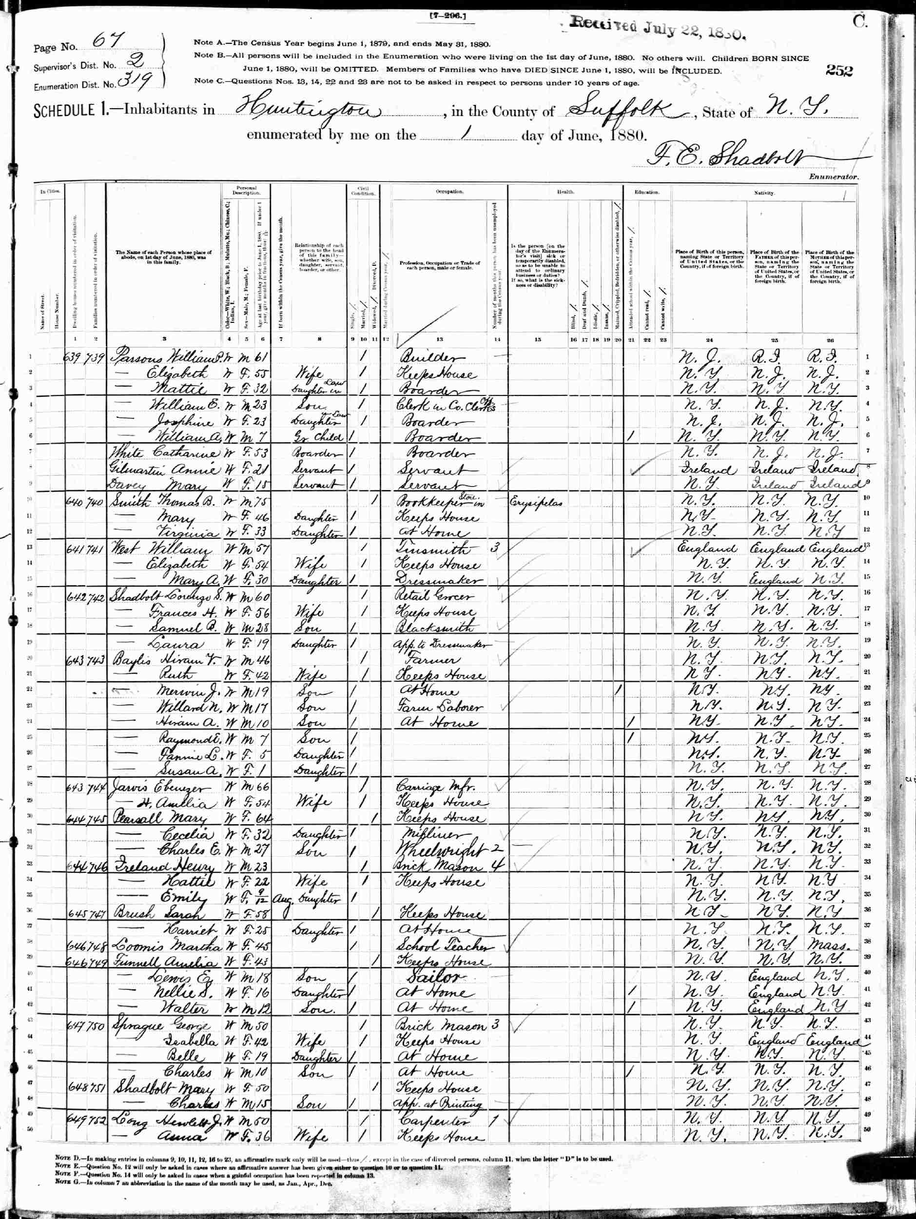 June 1, 1880 - Supervisor's District 2, Enumeration District 319, Huntington, Suffolk County, New York.